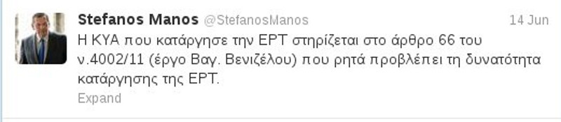 Συγκεκριμένα το πρωί η Ζέτα Μακρή δήλωσε στην τηλεόραση του ΣΚΑΪ ότι η Πράξη Νομοθετικού Περιεχομένου για την αναστολή λειτουργίας της ΕΡΤ βασίζεται σε νόμο του Ευάγγελου Βενιζέλου. Λίγες μέρες πριν ο Στέφανος Μάνος έγραφε στο twitter «Η ΚΥΑ που κατάργησε την ΕΡΤ στηρίζεται στο άρθρο 66 του ν.4002/11 (έργο Βαγ. Βενιζέλου) που ρητά προβλέπει τη δυνατότητα κατάργησης της ΕΡΤ.»