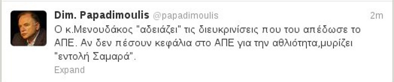 Γράφει χαρακτηριστικά ο Δημήτρης Παπαδημούλης: «Ο κ.Μενουδάκος "αδειάζει" τις διευκρινίσεις που του απέδωσε το ΑΠΕ. Αν δεν πέσουν κεφάλια στο ΑΠΕ για την αθλιότητα, μυρίζει "εντολή Σαμαρά".»