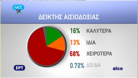 Από τα στοιχεία της έρευνας που έγινε για λογαριασμό της ΝΕΤ το 63% των Ελλήνων πολιτών δεν είναι ικανοποιημένο από την ποιότητα της δημοκρατίας στη χώρα, ενώ το 68% των ερωτηθέντων εκτιμά ότι πράγματα θα χειροτερέψουν.