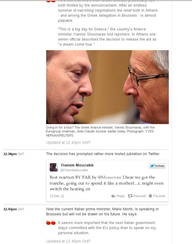 Το tweet μεταφράστηκε από έναν άλλο χρήστη του Twitter γράφοντας «μακράν το καλύτερο» και μετά από λίγο επελέγη από τον Guardian να τοποθετηθεί στο άρθρο-χρονικό του για τη σημερινή συνεδρίαση του Eurogroup, για να δείξει με χιούμορ και αυτός το κλίμα που επικρατεί στην Ελλάδα μετά την απόφαση των υπουργών Οικονομικών της Ευρωζώνης.