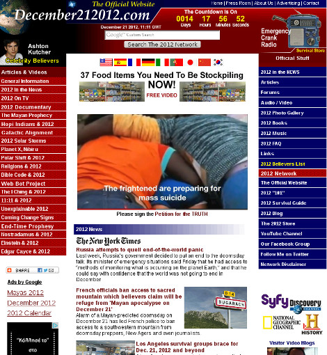 Αρθρα από όλον τον κόσμο που ασχολούνται με το τέλος του κόσμου που... πλησιάζει, λίστα διασήμων που πιστεύουν την προφητεία, αλλά και οδηγίες για το πώς θα επιβιώσουμε από τη συντέλεια του κόσμου.