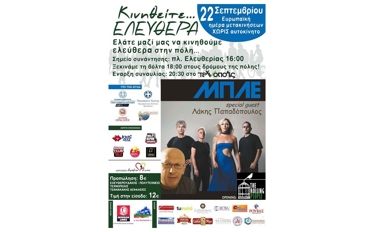 Με αφορμή την ευρωπαϊκή ημέρα μετακινήσεων (χωρίς αυτοκίνητο) την 22α Σεπτέμβρη, οι “ΔΡΟΜΟΙ ΖΩΗΣ” για να βοηθήσουν στην ευαισθητοποίηση του κοινού για πιο υγιεινό τρόπο ζωής, μετακίνησης και λειτουργίας γενικά των πολιτών στην πόλη, διοργανώνουν μια εκδήλωση με αφετηρία την πλατεία Ελευθερίας και τέρμα το “Τεχνόπολις” με αποκορύφωμα : Μουσική γιορτή – συναυλία.