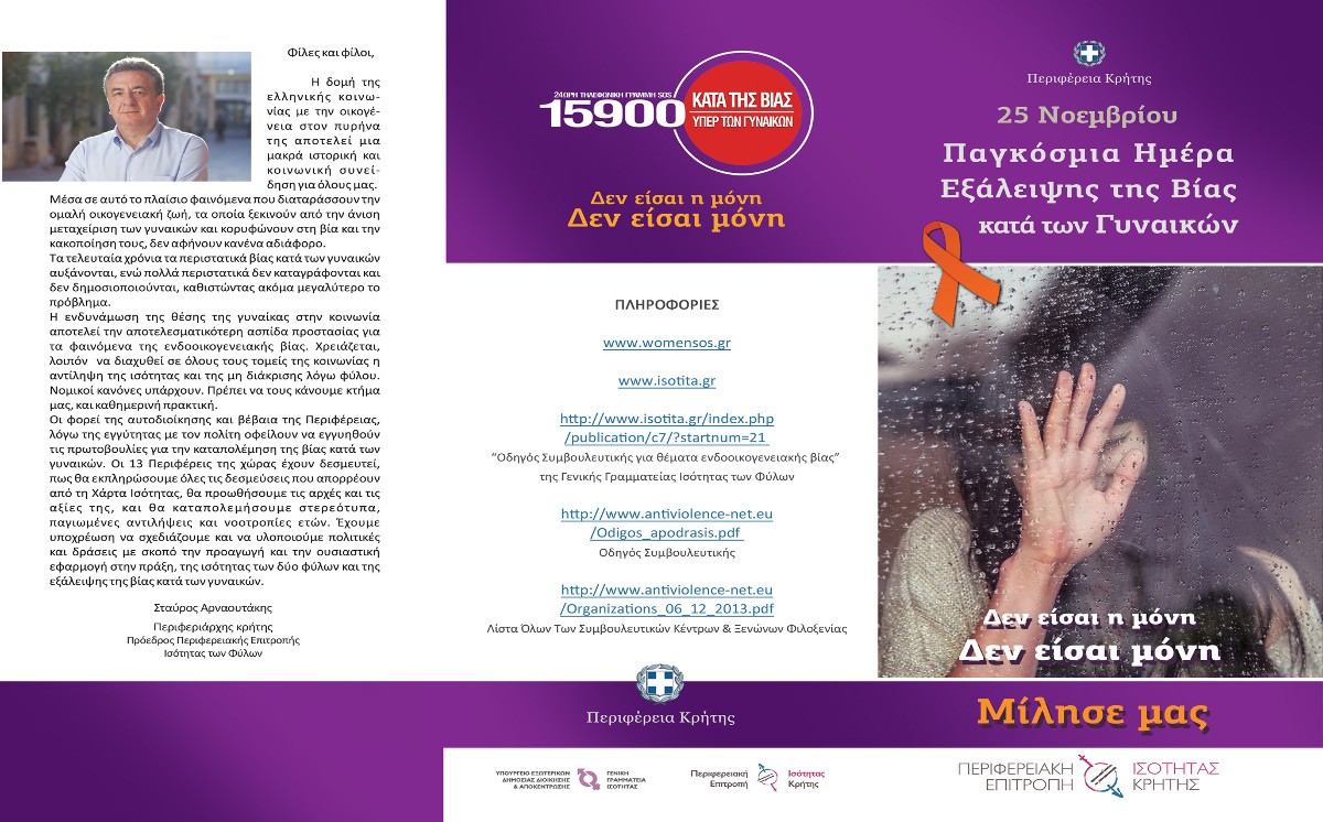 Η Περιφέρεια Κρήτης και η Περιφερειακή Επιτροπή Ισότητας Κρήτης σας προσκαλούν την Τετάρτη 25 Νοεμβρίου στο Επιμελητήριο Λασιθίου, στις 18:30, με αφορμή την «Παγκόσμια Ημέρα Εξάλειψης της Βίας κατά των Γυναικών».