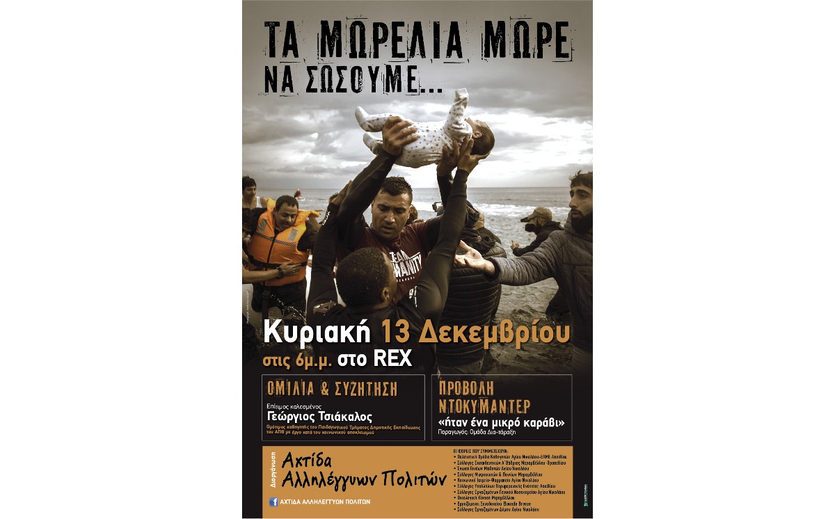 Μέσα σε αυτό το πλαίσιο, οι φορείς που συγκροτούμε την «Αχτίδα Αλληλέγγυων Πολιτών», σας προσκαλούμε να παραβρεθείτε στην εκδήλωση «Τα μωρέλια μωρέ να σώσουμε!» που οργανώνουμε την Κυριακή 13 Δεκεμβρίου στις 6μ.μ. στο κινηματοθέατρο ΡΕΞ.