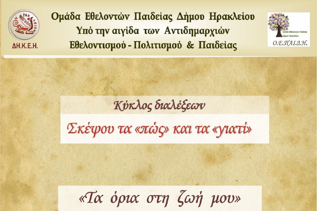 Η Ομάδα Εθελοντών Παιδείας του Δήμου Ηρακλείου υπό την αιγίδα των Αντιδημαρχιών Εθελοντισμού – Πολιτισμού και Παιδείας διοργανώνει κύκλο διαλέξεων, με τίτλο: Σκέψου τα «πώς» και τα «γιατί».