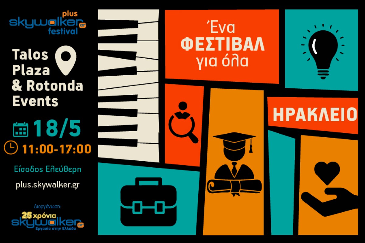 Το Skywalker Plus Festival, που τελεί υπό την αιγίδα της Περιφέρειας Κρήτης, θα πραγματοποιηθεί το Σάββατο 18 Μαΐου από τις 11:00 έως τις 17:00 στο Talos Plaza & Rotonda Events στο Ηράκλειο.
