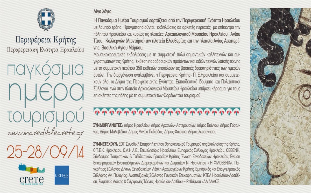 Με μεγάλη μας χαρά διοργανώνουμε και φέτος τις «ΗΜΕΡΕΣ ΤΟΥΡΙΣΜΟΥ 2014» μια γιορτή- θεσμό πλέον για το Ηράκλειο. Η Περιφέρεια Κρήτης- Π.Ε.Ηρακλείου σε συνεργασία με όλους του Δήμους της Π.Ε., τα εκπαιδευτικά μας ιδρύματα, φορείς τουρισμού και πολιτιστικούς συλλόγους γιορτάζει την Παγκόσμια Ημέρα Τουρισμού. Οι εκδηλώσεις για τον τουρισμό είναι ένα μήνυμα αισιοδοξίας. Ενωμένοι: αιρετή Περιφέρεια, πρωτογενής τομέας, τουρισμός, καλλιτέχνες, αποδεικνύουμε ότι μπορούμε να κάνουμε πολλά για την Κρήτη και την ανάπτυξή της. Αξιοποιούμε τις τοπικές δυνάμεις, τους κρητικούς καλλιτέχνες- συγκροτήματα αλλά και τους παραγωγούς τοπικών προϊόντων και οργανωμένα παρουσιάζουμε σημαντικά χαρακτηριστικά της πολιτιστικής μας ταυτότητας. Εύχομαι καλή επιτυχία σε όλους και ανανεώνουμε το ραντεβού μας για το 2015!»