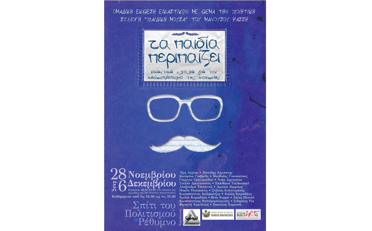 Στο πλαίσιο της Ημερίδας για τον Μανόλη Αναγνωστάκη που συνδιοργανώνουν το Αριστοτέλειο Πανεπιστήμιο Θεσσαλονίκης και το Πανεπιστήμιο Κρήτης, θα εγκαινιαστεί στο Ρέθυμνο, στο "Σπίτι του Πολιτισμού", στις 28 Νοεμβρίου, ώρα 16:30, η εικαστική έκθεση «Τα παιδία περιπαίζει», εμπνευσμένη από την ποιητική συλλογή Παιδική Μούσα του Μανούσου Φάσση (σατιρικό alter ego του Μανόλη Αναγνωστάκη).