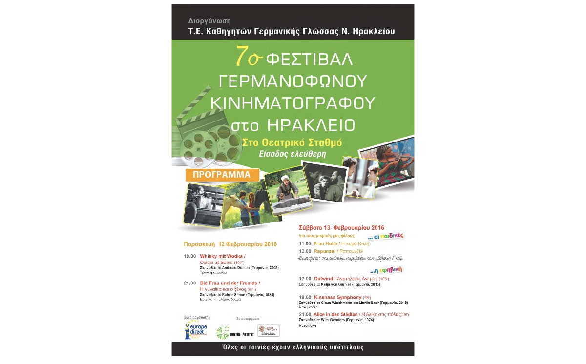 Η Τοπική Επιτροπή Ηρακλείου της Πανελλήνιας Ένωσης Καθηγητών Γερμανικής Γλώσσας Π.Ε. σε συνεργασία με το Europe Direct της Περιφέρειας Κρήτης και το Ινστιτούτο Goethe Αθηνών διοργανώνουν για έβδομη συνεχόμενη χρονιά το Φεστιβάλ Γερμανόφωνου Κινηματογράφου στο Θεατρικό Σταθμό Ηρακλείου.