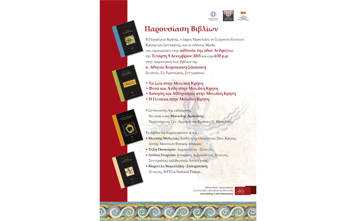 H Περιφέρεια Κρήτης, ο Δήμος Ηρακλείου, το Σωματείο Ξεναγών Κρήτης και Σαντορίνης, και οι εκδόσεις Mystis, σας προσκαλούν στην αίθουσα της οδού Ανδρόγεω, την Τετάρτη 9 Δεκεμβρίου 2015 και ώρα 6:30 μ.μ. στην παρουσίαση των βιβλίων της κ. Αθηνάς Κυριακάκη-Σφακάκη: Ξεναγός, Σ/ς Τραπεζικός, Συγγραφέας.