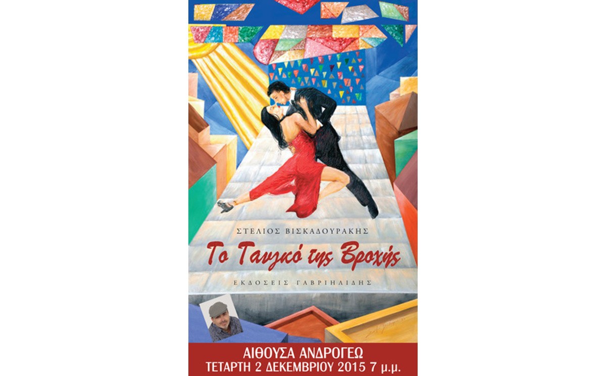 Το νέο βιβλίο του Ηρακλειώτη συγγραφέα Στέλιου Βισκαδουράκη «Το Τανγκό της Βροχής», που κυκλοφορεί από τις Εκδόσεις Γαβριηλίδης παρουσιάζεται σε εκδήλωση αύριο Τετάρτη 2 Δεκεμβρίου στις 7μ.μ. στη Δημοτική Αίθουσα της οδού Ανδρόγεω (2ος όροφος).
