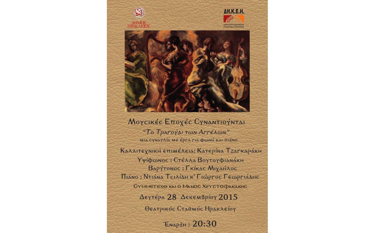 Συναυλία με έργα για φωνή και πιάνο κλασσικού ρεπερτορίου με τίτλο “Tο τραγούδι των Αγγέλων” θα παρουσιαστεί στο πλαίσιο των Χριστουγεννιάτικων Εκδηλώσεων του Δ.Η. «Χριστούγεννα 2015 – Πρωτοχρονιά 2016», την Δευτέρα 28 Δεκεμβρίου 2015 στις 20:30 στον Θεατρικό Σταθμό , με ελεύθερη είσοδο.