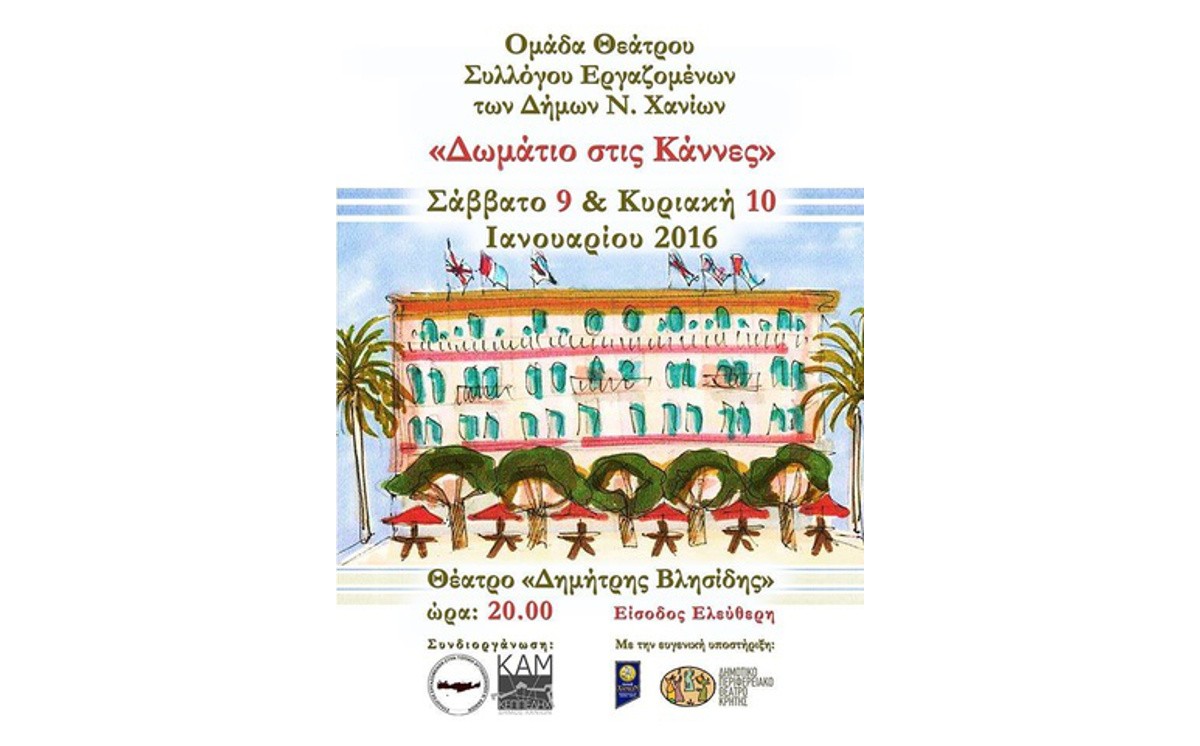 Η Ομάδα Θεάτρου του Συλλόγου Εργαζομένων των Δήμων Ν. Χανίων παρουσιάζει το έργο «Δωμάτιο στις Κάννες», το Σάββατο 9 και την Κυριακή 10 Ιανουαρίου 2016, στο Θέατρο «Δημήτρης Βλησίδης», ώρα 20.00, με ΕΙΣΟΔΟ ΕΛΕΥΘΕΡΗ.